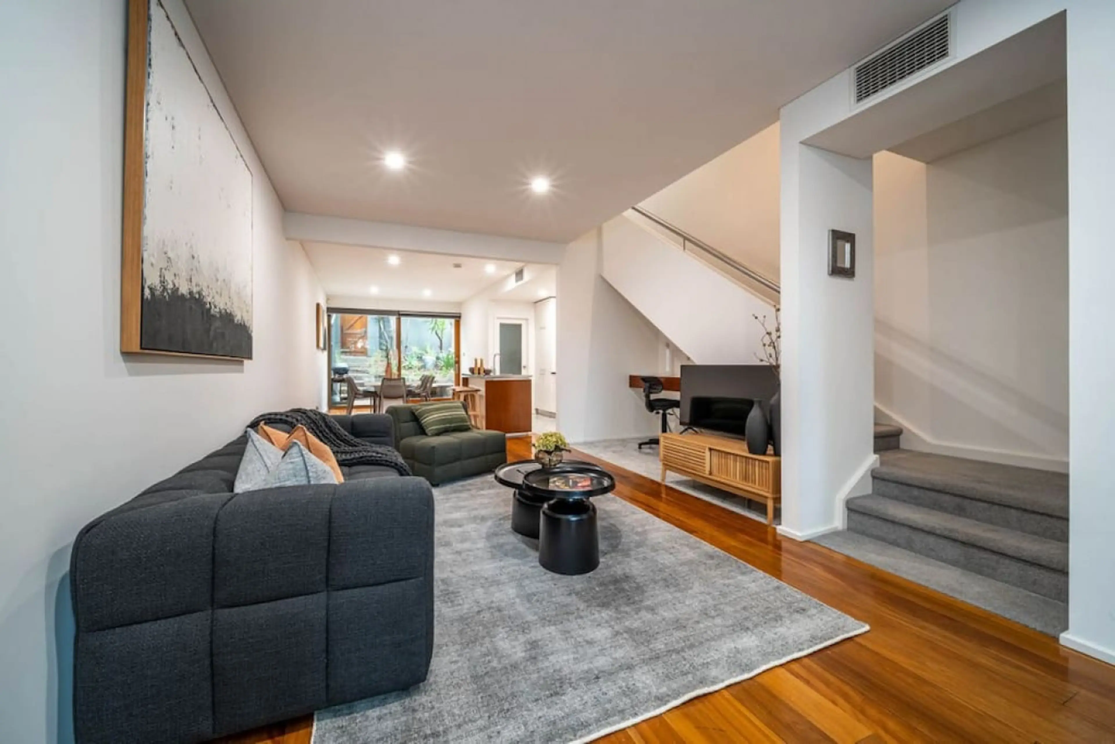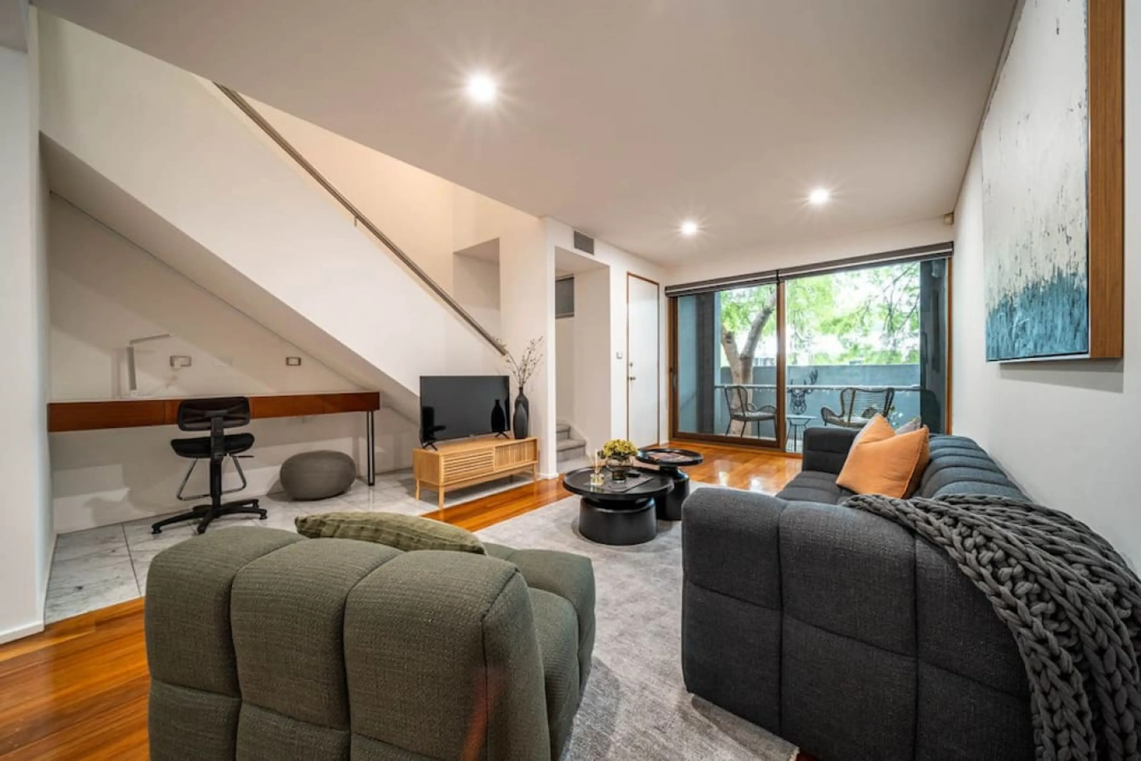 Step inside to a calm, well-considered interior where warm timber floors and soft, earthy tones create a relaxed setting for your stay. Natural light filters through large windows, while leafy outlooks add a quiet sense of privacy despite the city-edge location. The living area is designed for comfo...