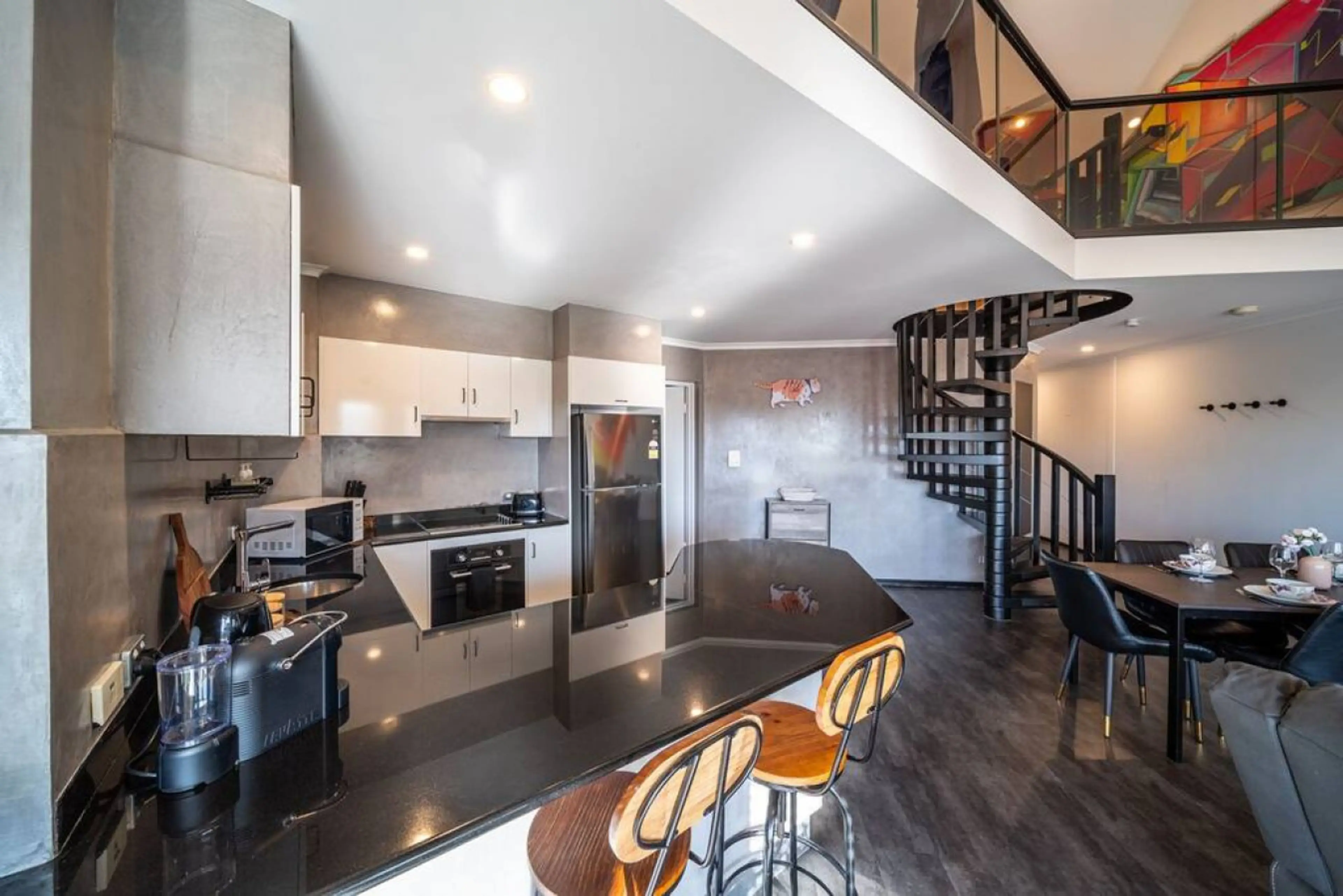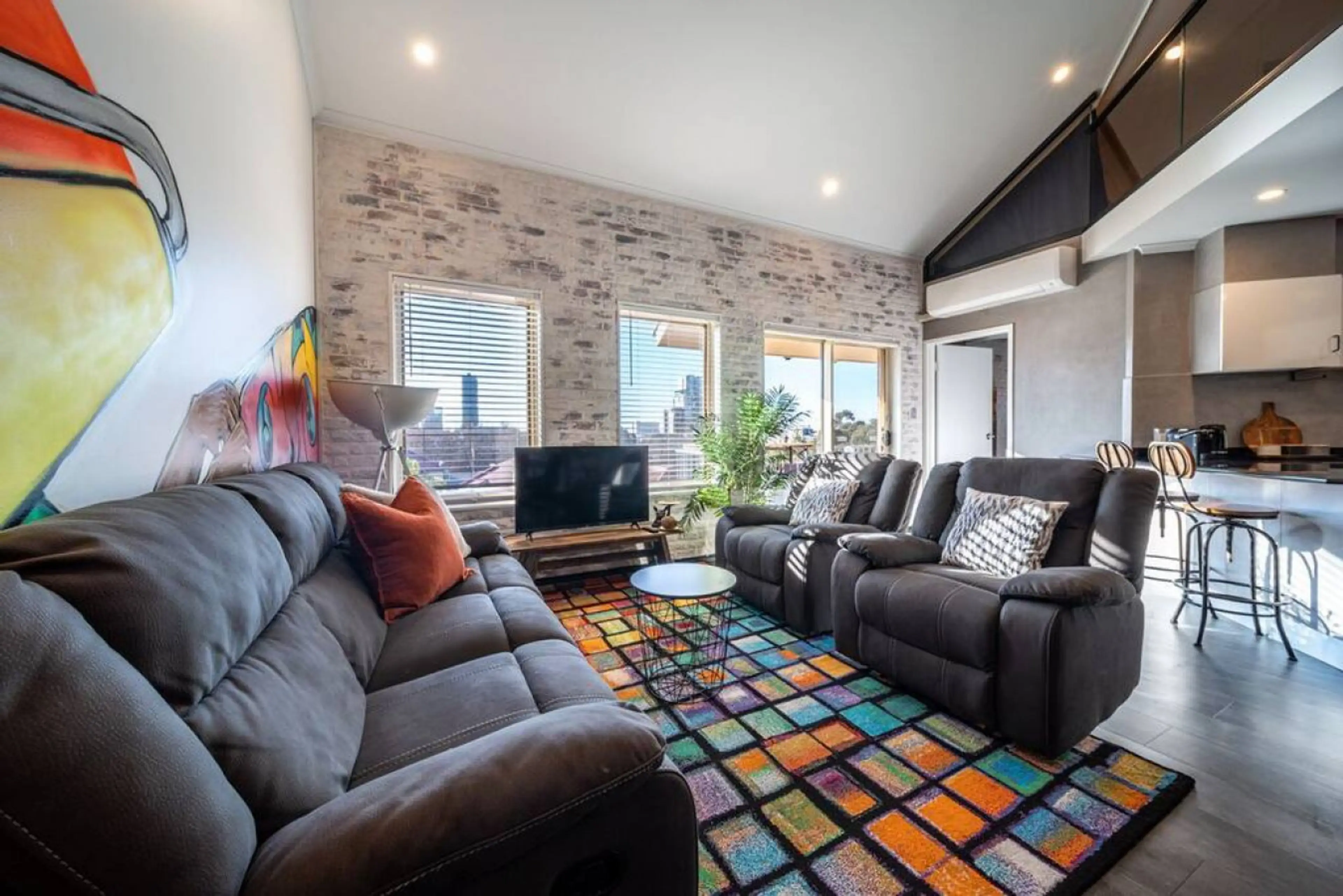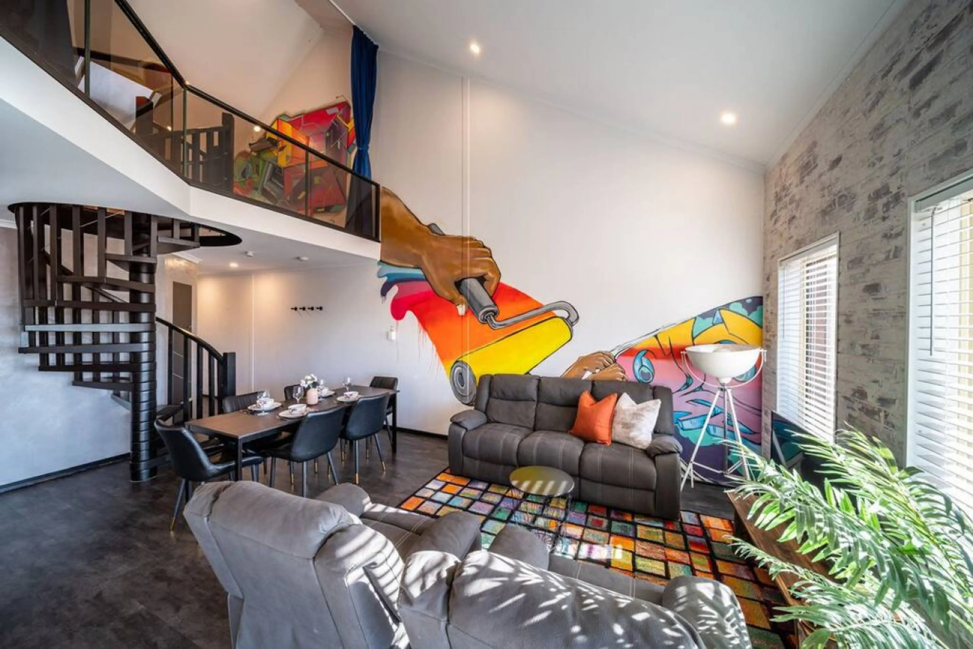 This apartment makes a statement from the moment you step inside. Large graffiti murals stretch across the walls, with vibrant splashes of colour and bold artistic details creating a space that feels creative, playful and completely unique. Designed for relaxed downtime, the living area features co...