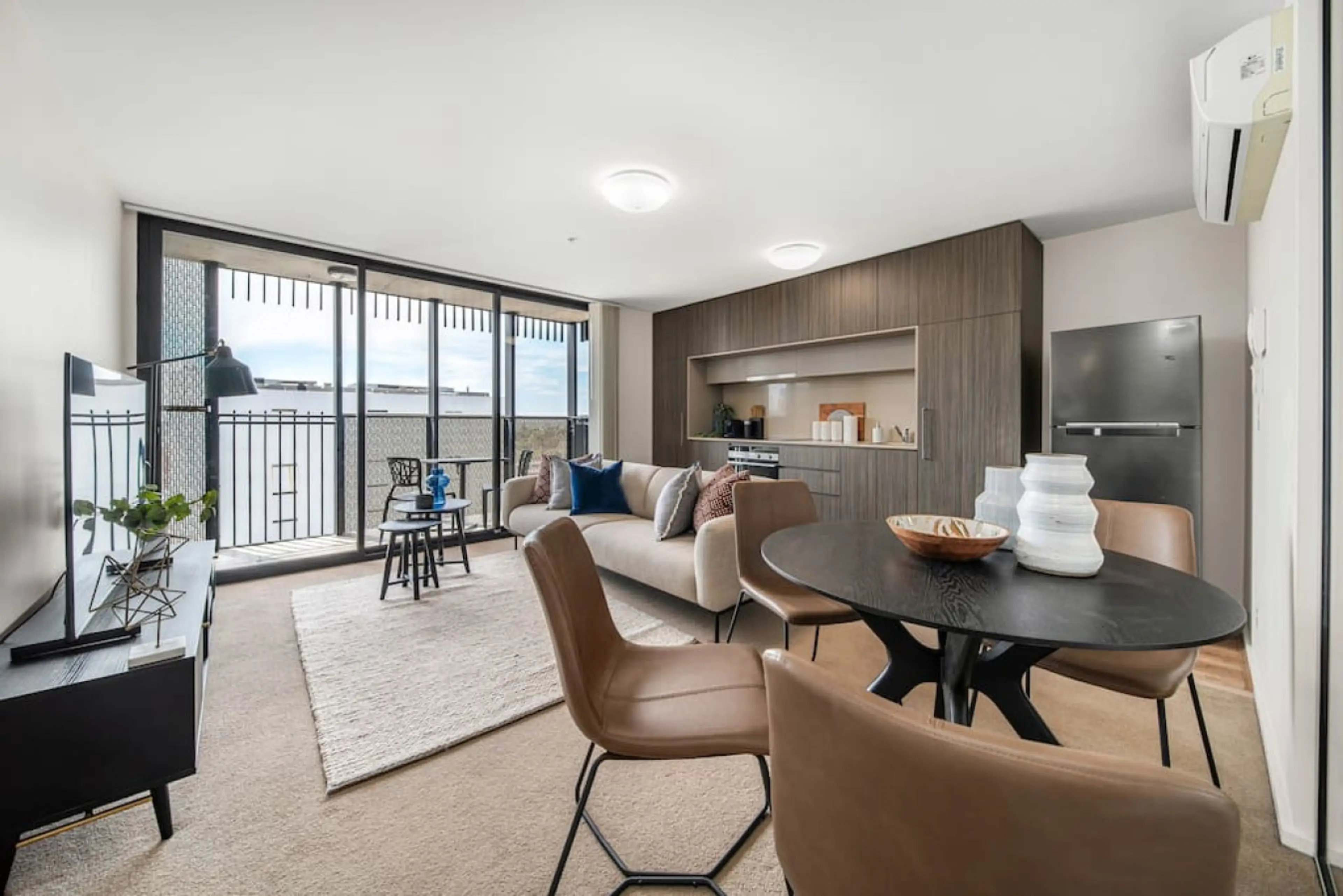 This thoughtfully styled apartment offers a contemporary retreat above the energy of the city. Clean lines, warm timber finishes, and soft furnishings create a welcoming atmosphere throughout, while large sliding doors draw in natural light and frame elevated urban views. The open-plan living area ...