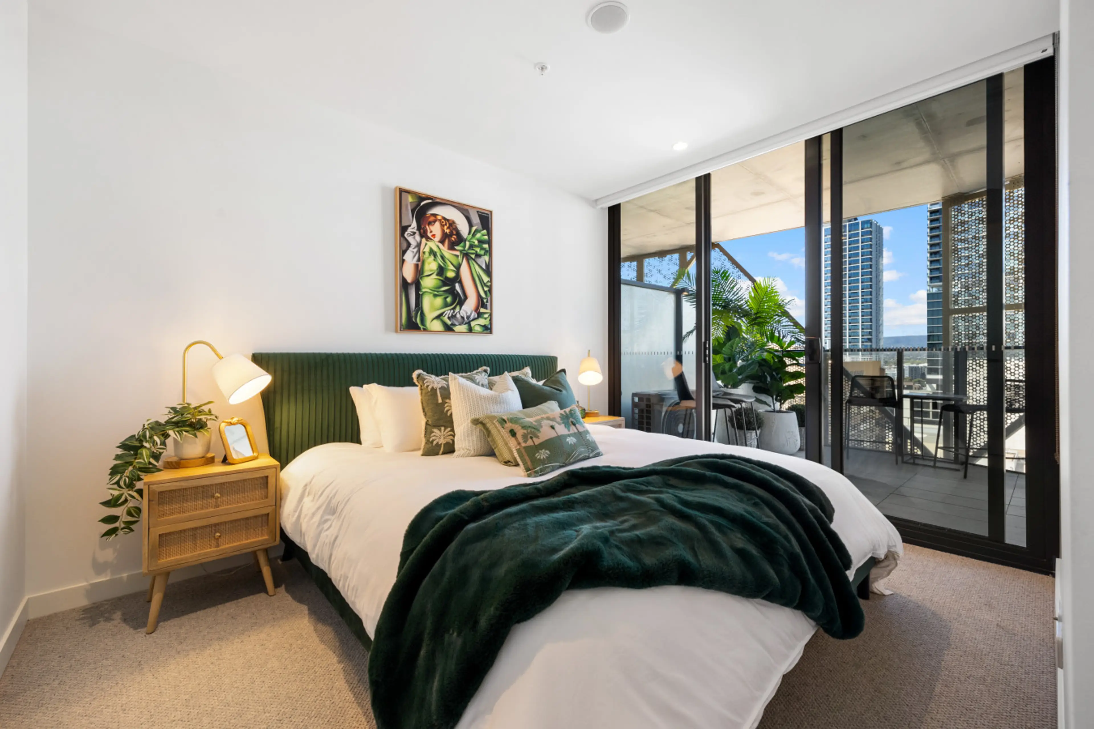 Filled with natural light and framed by sweeping city outlooks, this contemporary apartment blends clean lines with warm, inviting styling. Neutral tones are complemented by curated artwork and soft textures, creating a calm retreat above the CBD, while floor-to-ceiling glazing enhances the sense of...