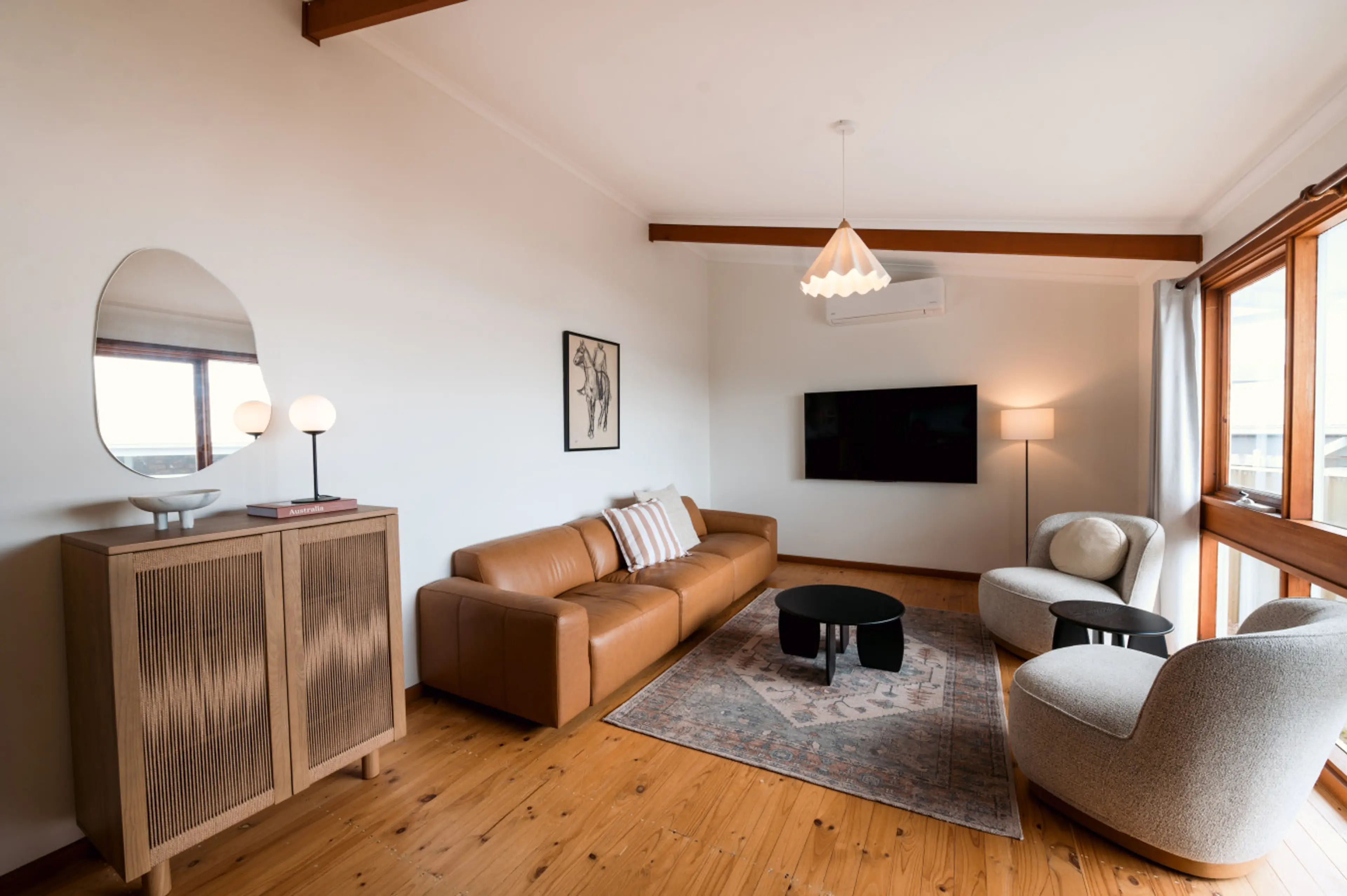 A relaxed coastal retreat with a nostalgic 70s beach-house feel, this light-filled escape blends laid-back charm with modern comfort. Spacious indoor living, a full kitchen, on-site parking, alfresco dining on the patio, air conditioning, and a fire pit create an easy setting to rest and reconnect. ...