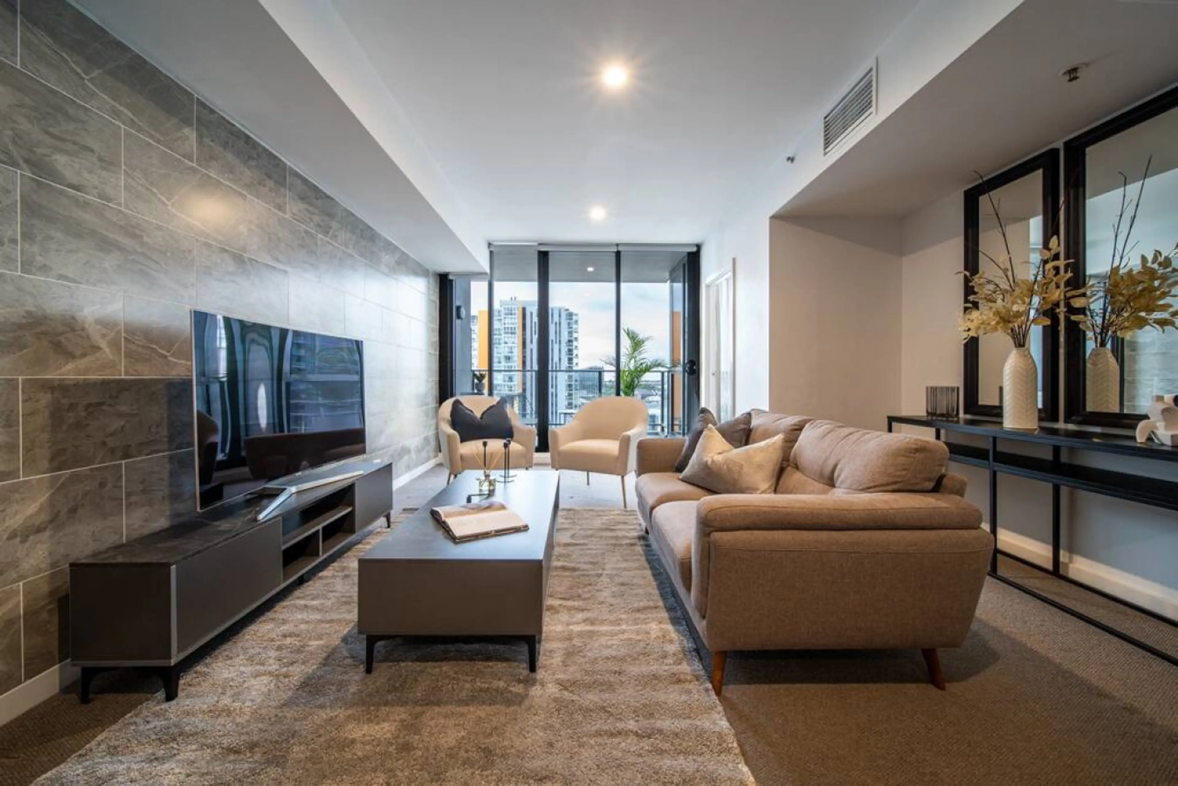 Above the hum of the city, a calm, contemporary space opens to light, views and effortless inner-city living. The living area is thoughtfully styled with a comfortable sofa, textured rug and TV, creating a relaxed setting for unwinding after a day exploring Adelaide. Sliding doors draw you onto the ...