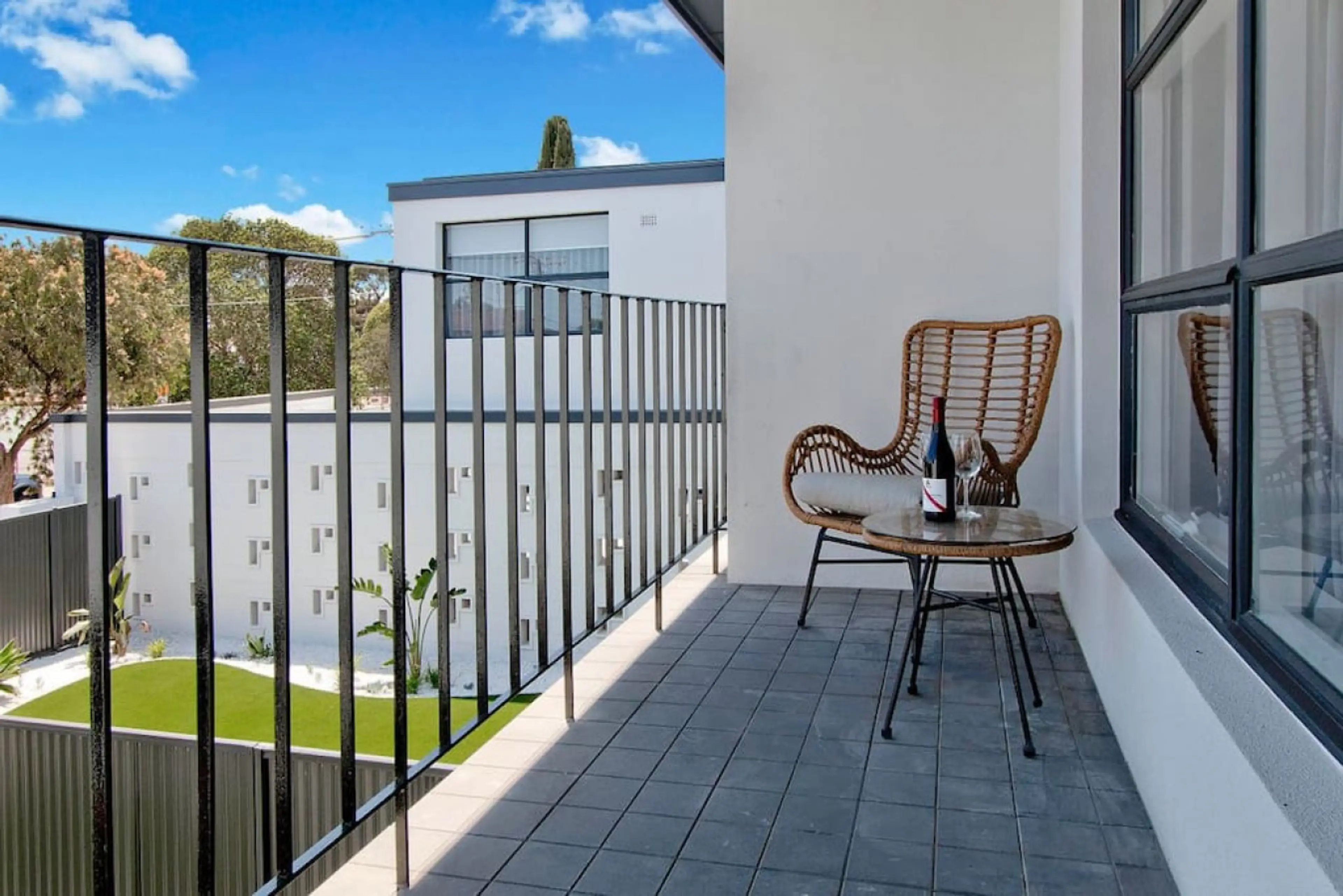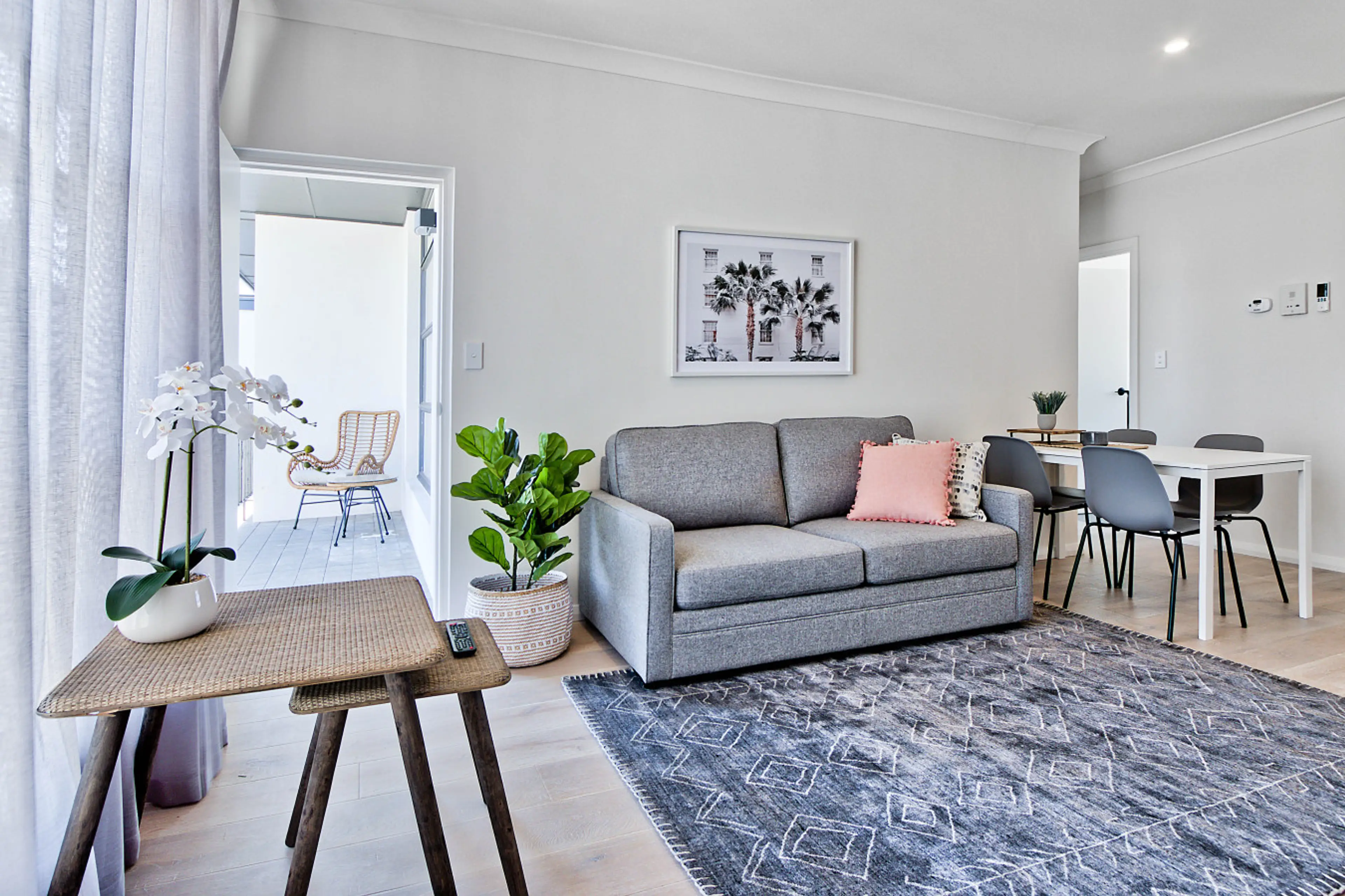 Located within Lotus Apartments, Bloom welcomes you through a private entrance with stair access to the first level, along with convenient keyless entry for effortless arrivals at any time. The living area is bright and inviting, styled with modern furnishings including a comfortable sofa, armchair...